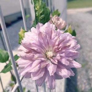 三ツ星品質モニターで頂いたクレマチスが咲きだしました✨️ ツルの伸びがあまりないコンパクトタイプのようです 大輪で花つきも良くとっても美しいです! はるかすみ、名前の通り霞がかったように薄っすらと藤色とライムグリーンのお色が美しいです♡ これからの成長が楽しみです♡