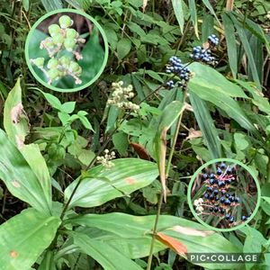 ヤブミョウガ(薮茗荷) 群落としてまとまりがあると、夏に咲く白い小さな花もきれいで…秋には濃い青色の丸い実を付ける。 見ると白い花があるのに早くも濃紺の 実をつけていました。