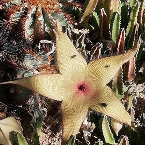 こんばんは😃🌃 下関園芸センターの スタペリアギガンティア😅 蝿がたかっています❓😅 ピントきました❓😥 臭いは嗅ぎませんでしたよ😥