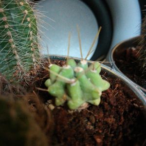 北向きサボテン。本日届いたネット購入の王冠竜。直径10cm。早速、大きめの鉢に植え替え。厳しい北向きベランダで優しく大切に馬鹿でかく育ててあげるね。