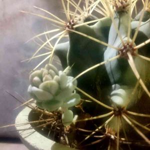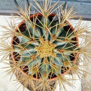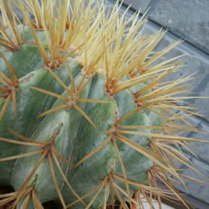 おはようございます! 朝の屋外気温が12℃です、サボテン達も少し寒さを感じ始めているかな! フェロカクタス属:王冠竜 青白い肌と飴色の刺が好きです!