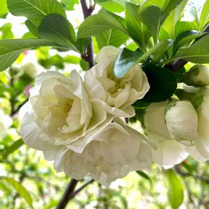 蓼科の山荘で庭の花をパチリ! 木瓜の花は、紅、茜色、白とありますが、山では白がことのほか美しい。 清楚で大好きです💕