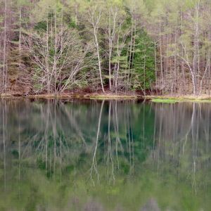 <御射鹿池> みしゃかいけにも行って来ました😃 東山魁夷の「緑響く」の日本画で、有名になった池。 透明度が高く、木々の映り込みが美しいです🌿