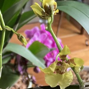 花友さんから、素敵な色みの オンシジウムを頂きました🌱 玄関が明るくなりました🎵 黄色のオンシジウム🟡 満開です♪ 昨年友人から頂き、植え替えたら 花芽をつけてくれて楽しみに、、 とっても可愛いお花がいっぱい咲いていますが、花茎が1.5mもあって 部屋に飾るには、大きすぎてビックリしています🫢 投稿写真⑤枚目、違う写真が、、😆🫤😅残念🫤