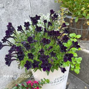 ペチュニアテヌートと寄せ植えた 真輝とバイプレーヤーが咲き出しました テヌートが良い感じにに引き締めてくれています 雨のあたるところに ハンギングで植え込んであります もうすぐ梅雨がやってくるので 雨への耐性も気になるところ どんな競演を見せてくれるかな