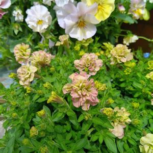 おはようございます😃 今日は雨が☔降っています☔️ ①三ツ星品質モニターのペチュニア ライムお花も増えてきました🥰 ②PWシモツケダブルプレイ ドゥージー ③スーパーアリッサム ④⑤ミニバラ🌹2種