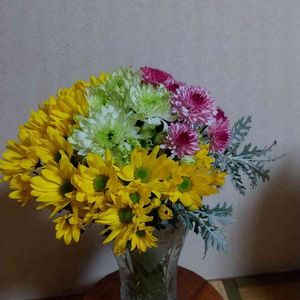 今日のお花 スプレーマム🏵️ たくさんのマムを頂いた時に スクランブルで花束💐にして花瓶に活けた時のpicです😊