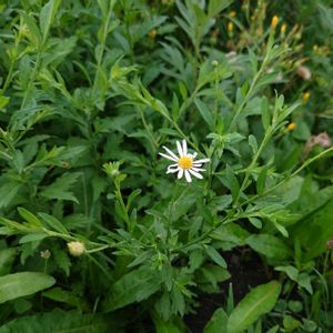 ユウガギク (柚香菊) キク科 シオン属 7~10月 30~150cm 多年草 在来種 日本固有種 葉は長さ7-8cmの長楕円形~卵状長楕円形で互生し、基部はくさび形で無柄 葉縁は浅裂~(羽状)中裂する (特に下部の葉は羽状に中裂) 両面に短毛があるが、触るとツルッとしている 葉形は変化が多い。。。 よく分枝し、側枝は広角度に長く伸び、先に1個の頭花を付ける (よく似たカントウヨメナは側枝が斜上気味に伸び、ユウガギクに比して横への広がりがないそうだ) 枝には小さな葉が付く 花径約2.5cm 舌状花は白色~淡青紫色 総苞片は3列 果実(痩果)は長さ2~3㎜の倒卵形 稜に腺毛が無い(←決め手 ?) (よく似たカントウヨメナは痩果の稜に腺毛があるそうだ) 冠毛は長さ約0.25mm 有って無いようなものだ🥹