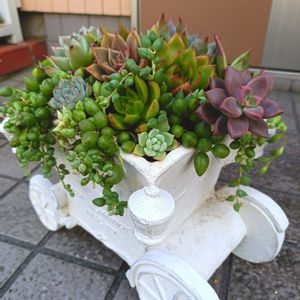2年前の誕生日記念に作った寄せ植え エケはあんまりイジった覚えはないけど セダムの傷みが激しいのでルビネから エンジェルティアーズに変えてます 去年はポリカの屋根の下に居ました 今年は雨ざらし⋯傷みが酷いなぁ