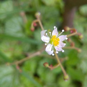 葉っぱばっかりから いつの間にか茎が伸び お花が咲いてる😃 葉っぱの模様が雪解けを想像させる 🐛 ユカリさんの 🏷️目に青葉~2025に ユキノシタ 1/4種目で参加します。