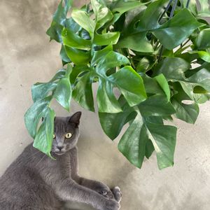 2023.11.5 みっちり締まって気根もニョロニョロでてるヒメモンステラ 葉っぱのツヤ感がすごいです 撮影のために床に置くとすかさず猫登場