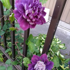 クレマチス 白が花園、紫が紫宸殿 このふたつをコラボさせたくて近くに植えています。 紫宸殿を今年移植して旧枝をかなりカットしたので下のほうしかお花がないのが残念ですが、何とかお隣で咲いてくれました😊 上のほうで一緒に咲くのは来年かなぁ😅