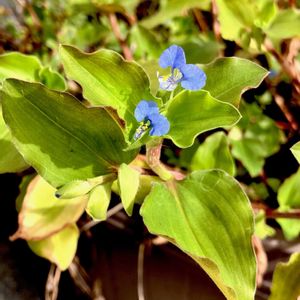 マルバツユクサ(丸葉露草) *ツユクサ科ツユクサ属 花期は7〜10月 関東以西〜琉球の海岸近くの湿った草地や田んぼ周りに地を這って伸びる一年草! 分布は関東以南が多く宮城県での目撃は少ないですが、我が家の隣りに今年も現れて花が咲きました! 名前の通り葉が丸く大きい! 軟毛があり縁は波打っています! 花は小さめで淡青色! ミッキーマウスの耳のようです♪ ④後に普通のツユクサが! 「あなた、何もの?」 と言ってるみたいでした💦 ☆10/8に千葉県で見た露草は9割がこのマルバツユクサの大群生で、繁殖力が強いのを実感しました❗️ 10月3日撮影