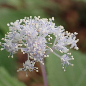 コアジサイ 高さ1〜1.5mの落葉低木。 葉は卵形で、大きな山形の鋸歯があります。(①) 枝先の花序に、淡い青紫色や白い、小花をつけます。花は、両性花で、装飾花がありません。 白い花。(②) 花びらは、5枚。雄蕊は、10本前後。花柱は、3〜4個ありました。 淡い青紫色の花。(③) 茎まで、淡い青紫色でした。 茎にも、葉にも粗い毛がありました。(④) ここの、コアジサイは、薬用植物園で咲いていたので、植栽だと思います。 どういうわけか、コアジサイは、高尾山では、少ないそうです。奥高尾まで行かないと、ないと聞いたので、今年は、きっと、探せないと思い、薬用植物園へ、見に行ってきました。 5.26