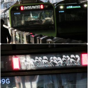 10月のJR山手線のお尻表示です。 花はススキ(尾花)です。まさにお尻の表示で尾花。 初めて山手線の内回りと、外回り(ススキの絵)電車を一枚に入れられました⬆️の写真です✌️ ⬆️の右の電車は前向きの姿です。