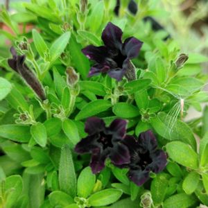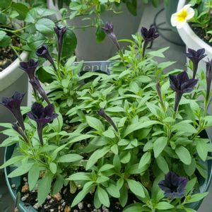 ペチュニア テヌートの経過報告です。 ①②③6月10日梅雨入りして本日大雨です。 軒下に入れてますが雨にあたってます。 黒から黒紫のお花も綺麗で、 株も大きくなりました。 ④5月12日に摘芯しました。