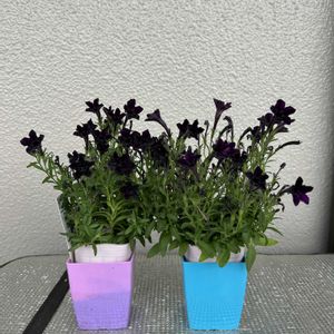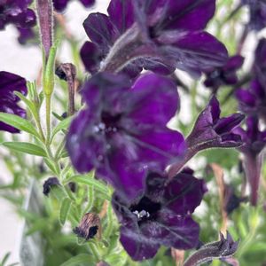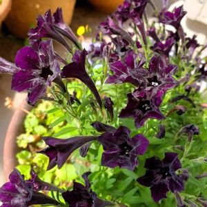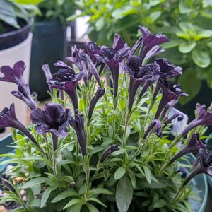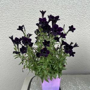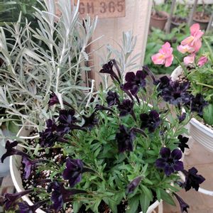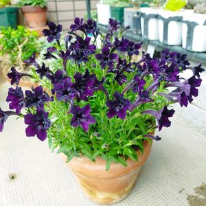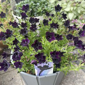 ペチュニア テヌート🖤⟡.· モニター報告です😃 植え付けから17日。 追肥(液肥)はまだしていませんが、ほぼ鉢いっぱいになってきました。 雨の日は軒下に入れています。 あまり横に張らないのでスッキリとした印象で、この色は花ガラが目立たないところもいいですね😙 🤳撮る角度やお天気によって、色が紫寄りに見えたりしますが、3枚目が1番リアルに近い色です。 隣りに極小輪のバラ、マリリンを置いてあり、おふたりさんの相性がいいなぁ、と。 淡いピンクの小花と寄せ植えにしてみたかった🖤🩷️ 4枚目は実際の寄せ植え。 リーフのみ🤣 白花とも合いそうと思い、ブライダルシャワーの前に置いて撮ってみました♪