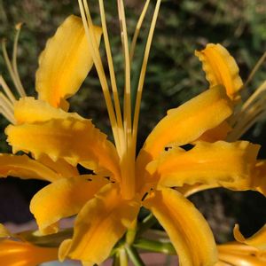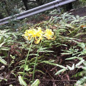 今日のお花🌼 キイロイ💛ヒガンバナ というかオレンジに近い! 元気が出ます(^O^☆♪ 今日撮れたて❣️ 会社🅿️の花壇 社長が言うには花が咲くのに3年かかったそうです 球根は難しいようです🤨