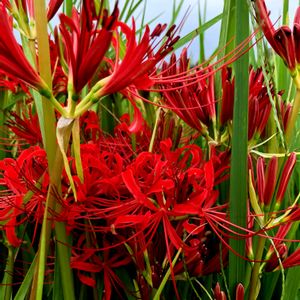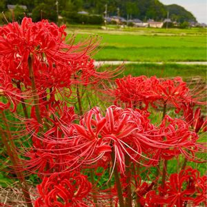 近所でいつも彼岸花が咲くところ… 晴天の昨日、通りがかったらちょうど満開でした❣️ すぐ横の青いサルビアとの色のコントラストが いかにも秋らしくて……🍂