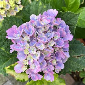 マジカルショータイム 斑入りの葉のあじさいです。 昨年秋に斑入りの葉とカラフルなお花の写真に惹かれて小苗をお迎えしました。 写真のように色々な色が混ざって咲いてくれました🎵 完全に開くのが楽しみ💕💕