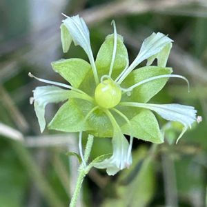 ナンバンハコベ(南蛮蘩蔞) ナデシコ科 マンテマ属 北海道から九州の山野に生える多年草 花期6〜10月 別名 ツルセンノウ 名前の由来 花の形が珍しく異国的 と言う説があるが、帰化種ではなく、在来種 また、花や果実の形が風変わりだと言う意味もある 茎はよく分岐し、蔓の様に細く伸び、他の植物に寄りかかる様に成長する 花は枝分かれした小枝の先に、横向きや下向きに1個つける 萼は緑色で、釣鐘型になり5個に裂ける 花びらは5個で、離れてつき白く細長く、先端が2つに裂ける 雄蕊は子房の周りに10本、雌蕊の花柱は3個 萼と繋がる萼筒は半球形で後ろに突き出る 花弁には鱗片がついている(反り返って見える所)ので、花弁が下向きに折れ曲がる 花の直径2cm、果実の大きさは8〜10mmで黄緑色から黒色になる ハコベと言うと小さな花を今まで見ましたが、この花は大きくて不思議な形でとても可愛いです 南蛮というだけあっておしゃれな洋風の花に見えます 8/10