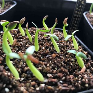 今年は、色々な実生を楽しみたいと思います♪ 播種から5日で、13/14発芽! パキポディウムのホロンベンセ! 発芽したばかりなのに、もう形がぽくなってる😆