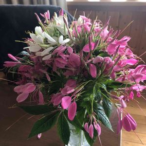おはようございます🐦ピピ ☔の影響が ひどくなりません ように💚 今日はGSクレオメの日 茎はネバネバ、 チクッで 大変不快でした。 でも、 花びらは大人の 優しいお花でした。💮