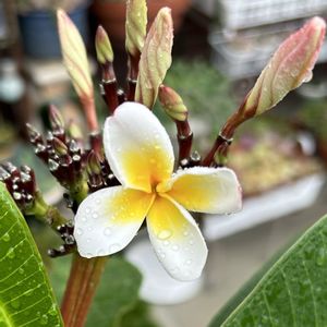 こんばんは😊 プルメリア 一番花が咲きました🏵️✨ でも…なんか変… 🔍してみたら、普通は花びらが5枚あるはず! なーんだ、上手く咲かなかったんだ〜😓と思っていたけど 四つ葉のクローバーのように、4枚花びらのプルメリアは幸せを運んでくれるらしいと書いてあるのを見つけて 急に愛おしくなった現金なやつです😁
