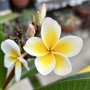 こんばんは😊 昨日も投稿したプルメリア🏵️ 今日また一つ咲きました♪ 幸せの花びら4枚もいいけど、やっぱり5枚の花が可愛い😆💕
