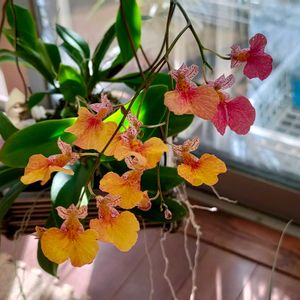 オンシジウム カネツナーラ はじめに咲いた花は茶色っぽかったのですが、あとから咲いた花は黄色でした。 しかし、少し色が濃い目な気がします。 もっと鮮やかな黄色だったのではないでしょうか? 花色が年によって変わることがあるのでしょうかね? でも綺麗だから良いか😆