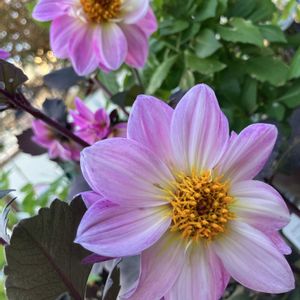 ↑2年目の黒葉ダリア カクテルアミーゴ🍷 ↙︎ハイビスカスフラミンゴ🦩 10㎝くらいの挿し木に お花が咲きました❣️👏🏻 ↘︎ダイソーの種で咲いた色鮮やかな 絞り咲き百日草🎶