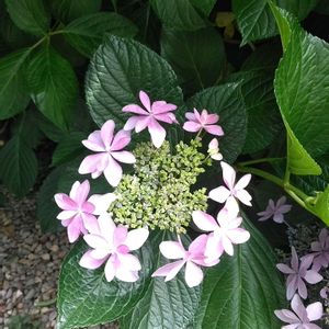 おはようございます。 紫陽花ダンシングパーティだったかな? その紫陽花と庭のバラ🌹や黒の瀬戸…黒葉ダリア マトカリアを玄関に…❤️