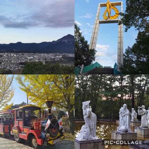 秩父ミューズパーク🏞️ 右上、展望台 右下、ミューズの泉の女神たち 左上、展望台から見る秩父の景色(右上の山は武甲山) 条件が良ければ、ここに雲海がひろがります。 左下、スカイトレイン