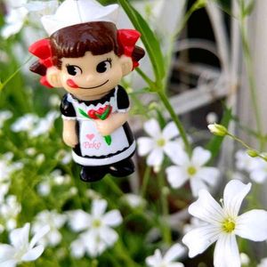4月25日(月) 🏷️ペコちゃん祭り 参加させていただきます😃 ペコちゃん持ってお庭に行ったらカスミソウがゆらゆら風に吹かれ揺れていたのでカスミソウとペコちゃんで撮して見ました🐸💞