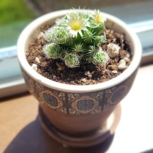 先日買ってきて、鉢に移したサボテンに花が咲きました😊 ちゃんと根付いた証拠かな? にしてもかわいい🥰