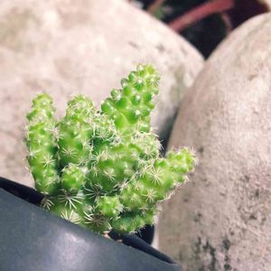 ギンテマリさん🌵 …のはずだったんですが、徒長してこんな姿に🥲 棘がぜんぜん伸びずに背丈ばかり伸びてしまいました💦 他の子と同じように、室内の窓辺にいて時々ベランダへ生活だったんですが。 日光が足りないところに、お水をあげ過ぎたのか…。 この子の徒長具合が一番すごいです😵💦