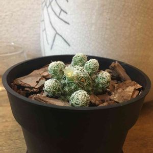 DAISOさんのサボテン🌵 ギンテマリ 銀手毬 棘が痛くない優しいサボテンよ♫と 教えていただいたギンテマリ✨ 小さな🌵の ちいさなちいさなお花がひとつ!✨ 可愛い(*˘︶˘*).。*♡💛
