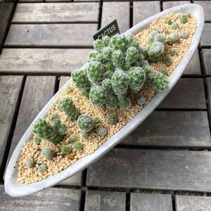 徒長して伸び伸びのギンテマリ二鉢を、一つにまとめてみました。 穴が空いてないけど、お気に入りの鉢に。 鹿沼だけで、うまく育つかな? ほったらかしても枯れなかったので、大丈夫でしょう☺︎ 台風で室内に全て入れていた多肉たちをベランダに出して、久々に太陽を浴びてます☀️ 全て動かすことはないので、ベランダ掃除もできて、配置換えもできて、いい経験になりました。
