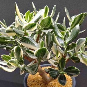 ●ベンケイソウ科 ●クラッスラ属 ●花月錦😸😸 久々に花月錦投稿します。☝️🤓 去年の2月から9月頃までマンション修繕工事の為に全ての植物を室内で管理していました。😅 その為日照不足で、徒長、間延び、根腐れなど全ての植物が悲鳴をあげ、ダメになった子が多々ありました。😅 この花月錦も悲鳴をあげた一つです。…😅😅😂🤣 この子の場合、根腐れはしませんでしたが、数枚の葉を残しポロポロと葉を落としていきました。😅😭😅😅 マンション修繕工事が終わり、ベランダにだしてから約9ヶ月後の姿がこの画像ですね。☝️🤓 一時はほぼ枝だけ状態でしたが、徐々に新芽をだして見事に復活です。(笑)😆😆😆😁