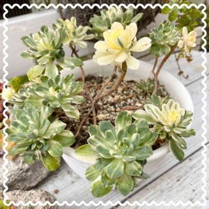 昨年人気のあった 子持ち蓮華カスタード❣️ 子持ち蓮華錦とは斑の入り方が違うんだって‼️ マダラな斑入りになったり 内側に斑が入るのがカスタード🥰 外側に斑が入るのが子持ち蓮華錦👍 昨年なかなか根付かずもうダメかと思ったけれど 無事冬越しからお目覚め💓 他の子持ち蓮華&子持ち蓮華錦は 一年中雨晒しだけれど… カスタードは去年の経験から 梅雨の時期に弱い気もするのよね😅 たくさん増やした〜い💪