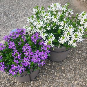 スターティアラ ブルー (スカエボラ) スターティアラ ホワイト 花びらが星型についています🌼 お花が咲きそろってきました~ SUNTORY2025新品種です。 φ(..)2025.4.18 8号鉢に植え付け