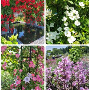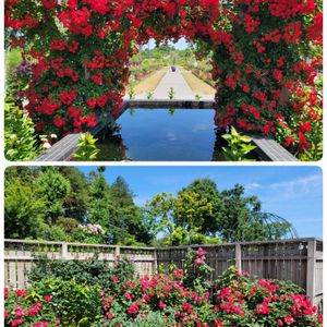 赤いバラは『クロンヌルージュ』 シュラブ樹形のしなやかな枝ぶりが 宿根草と一体化した見事な植栽😍 ’あやせローズガーデン‘ で 1番最初にここ『ウエルカム・ガーデン』エリアに足を踏み入れます(pic①) ダマスクの強香🫧ともに 胸が高鳴りました🧍♀️ドキドキ 黄金葉のコデマリ 濃ピンクのガウラ 赤いダイアンサス ヒューケラ エリゲロン 『フラワー・ヒル』(pic②)が 気持ち良かった〜🤸ヒャッフォー! 紫色のキャットミント(ネペタ)💜を 川に見立てています 小高い丘になっているのですが 川が岩🪨の間をキレイに流れているように 植栽されてるそうです ただまだ白いバラ🤍の背が低く ネペタ💜と同じくらいの高さの今より これからが楽しみな場所と ガイドさん👩🏻🚩が言ってました pic③ とにかく『フォルジューム ジュバダム』が美しい景色でした ほんの少しでいいから 庭の一角に作れるかなイヤ..デモ..イヤ.. 悩ましいほど美しい😮💨 pic④ 『トロピカル・ガーデン』出口の バラのトンネルは最盛期を過ぎた そうですが 充分美しかったです 人が入ってしまったので コラージュで雰囲気を... ‘あやせローズガーデン’は 150種680本のバラが咲き乱れてる そうですが 宿根草や一年草との調和が1番の見どころと感じました🤗