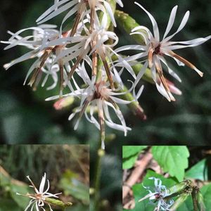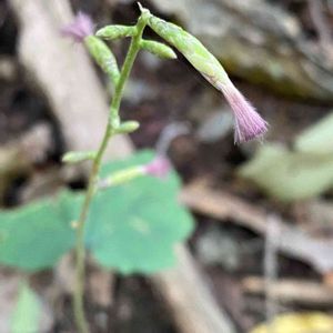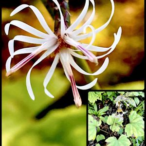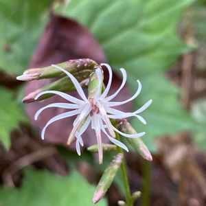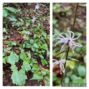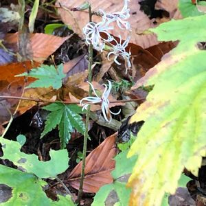 多分… ◆オクモミジハグマ(奥紅葉白熊)◆ キク科の多年草 花期は8〜10月 本州〜九州北部の山地の木陰に生える。集まってつく葉の中心から花茎を伸ばし、数個の白い花が横向きにつく。花柄は長さ2mmほど。花は3個の小花が集まった頭花で直径約1.5~1.8cm。花弁は5裂し、左右相称。先がカールし、リボンを広げたように見える。花が終わると、羽毛状の毛が生えた種をつける。 この日は、キッコウハグマ見たさの山行。12km程を歩きながら、ビジターセンターで訪ねた先に向かう。随分と疲れたキッコウハグマだなぁ…🙄と思いながらも、疑いもせずに撮影。ルンルン♫で帰宅し写真を見返すと、なんだかちがーう😭!!ザンネ〰ン まぁ、この子も初見で可愛かったから無駄足ではなかったかな😂 良い1日を、お過ごし下さい♫ ※尚、名前が違っていたら、お教え下さい。 2021.11.4 高尾山にて📷
