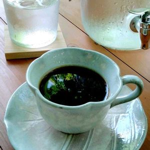 番外編です。💦💦 今日午後3時の珈琲ブレイクです。 カップの中に周りの森の緑が映えています。 🌿🌱🌼💐🏵️🌸🌿🌱🌼💐🏵️🌸🌿🌱