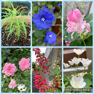 朝から元気なお花たち🌼🌸 ↖️種まきコキア一株ずつ小さめの鉢に植え替えたら、急に元気になってきた‼️まだまだ小さいけど、がんばれ‼️ ↙️母の日に義母にプレゼントした超ミニバラ🌹舞姫。枯れる寸前をカットして✂️して、やっとまた咲いてきました❗️この後はな色が白に変わるんですよ🤗 ⬆️エボルブルスアメリカンブルー。朝は綺麗に咲いてるのよね🤗❣️ ⬇️名前忘れたサルビア赤とピンク😅紫陽花の横っちょからわさわさ咲いてきました👍🤗 ↗️先日もアップした破れ咲き朝顔。もう少し開くけど、ほとんどの花がこんな感じです。花弁、ボロボロにキレちゃってます🥲 カンパニュラパール、白と紫のお二人。途切れることなくどんどん咲いてます。ちょっとお花が小さくなってきちゃった😂 今日も🥵だけど、みんな頑張って😆💪🥰