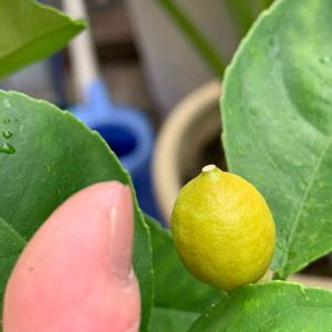 なんと‼️もう黄色くなってる😅 まだ、わたしの小指の爪くらいしかないのに😱 肥料不足なの⁉️日照不足⁉️それとも、まだ今年は大きくなるのは無理なのかな😆木が小さいから。 えっ?これは何かって⁉️ レモンです🍋😭