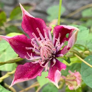 こんばんはー🤗 なんだか急に涼しいし、日が暮れるのは早いしで、もうこんな時刻‼️ ご飯作らなくちゃ😅 今朝、スプリットペダルを見ていたら、一緒に絡んでいたクレマチスの花が咲いてました❗️なんだか、春に咲いてたのとはまるで違う花みたいに見えるけど😥 そして、虫食いー😱 本当にいろんな花が食べられていて、がっくり😮💨 珍しく咲いてたから、あんまり綺麗に咲けてないけど、up😅