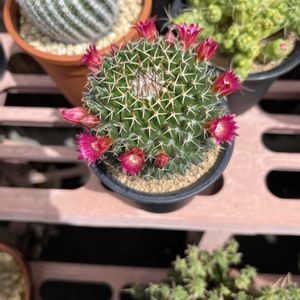 マミラリア 白鳩丸 をお迎えしました😅 お花がぐるりと一周付いています♪咲いたらかわいいでしょうね😊 旦那さまは🌵この形のサボテンが欲しかったようですが🤭そう簡単に出会えません🤣 トゲに注意しながら、多肉達とご一緒します😅 サボテンなんてお世話するのは何十年ぶりでしょうか🤔10年…20年…30年ぶりかも🤣🤣🤣