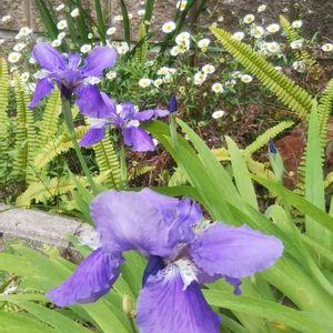 イチハツが咲き始めました。 白い小花はお隣のお庭から飛んできたエリゲロンです。はじめはハルジオンと間違えて雑草だと思ってました…。よく見たら可愛い(笑)