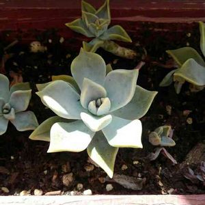 皆さんのpicのようにオシャレでキレイな画像じゃないのでお恥ずかしい。(´・ω・`) 2016年末に買ったグラプトペタルム・朧月。 初めは室内管理でしたが、 去年春頃から外のプランターで育ててます。 1本しかなかったのに次々に増殖して若干困ってます(笑) 葉挿しで増殖させてるのは自分ですが。(´・ω・`) どうせこんなに増えるんなら、 ピーチ姫や姫秋麗辺りがよかったなとか浮気心がふつふつと。 夏の直射日光にも、冬の寒さにもびくともせず増殖。 朧月、こいつぁ雑草並みに強いと確信したので、 霜が当たろうが真冬だろうがお構い無しに、 外で厳しく育ててます。(´・ω・`)